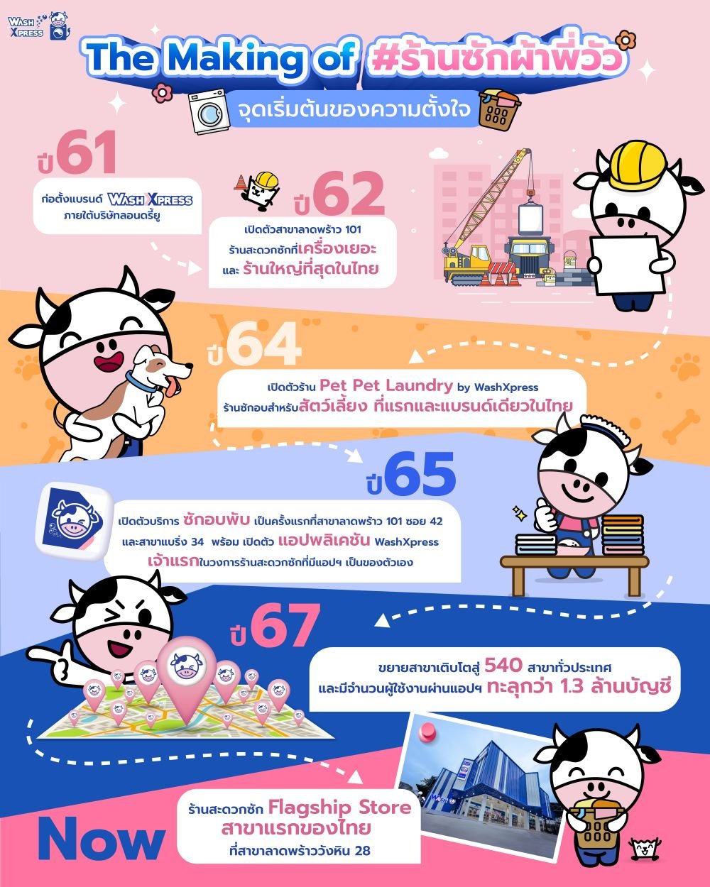 มีเหตุการณ์สำคัญอะไรบ้าง ไปดูกัน ตลอด 6 ปีที่ผ่านมา WashXpress มีความตั้งใจในการพัฒนาอยู่เสมอ เพื่อมอบบริการที่ดีที่สุดให้กับลูกค้าทุกคน ร้านพี่วัวจะไม่หยุดพัฒนาอยู่เพียงเท่านี้ แบรนด์จะยังพัฒนาต่อไปเพื่อยกระดับประสบการณ์การซักผ้าให้ดียิ่งขึ้น เพื่อ #ให้การซักผ้าเป็นเรื่องง่ายสำหรับคุณ