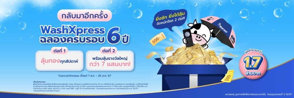 WashXpress จัดแคมเปญใหญ่เพื่อแทนคำขอบคุณลูกค้าที่สนับสนุน WashXpress มาตลอด 6 ปี กับแคมเปญ “แจกหนักเป็นกอง แจกทองกับพี่วัว ฉลองครบรอบ 6 ปี”